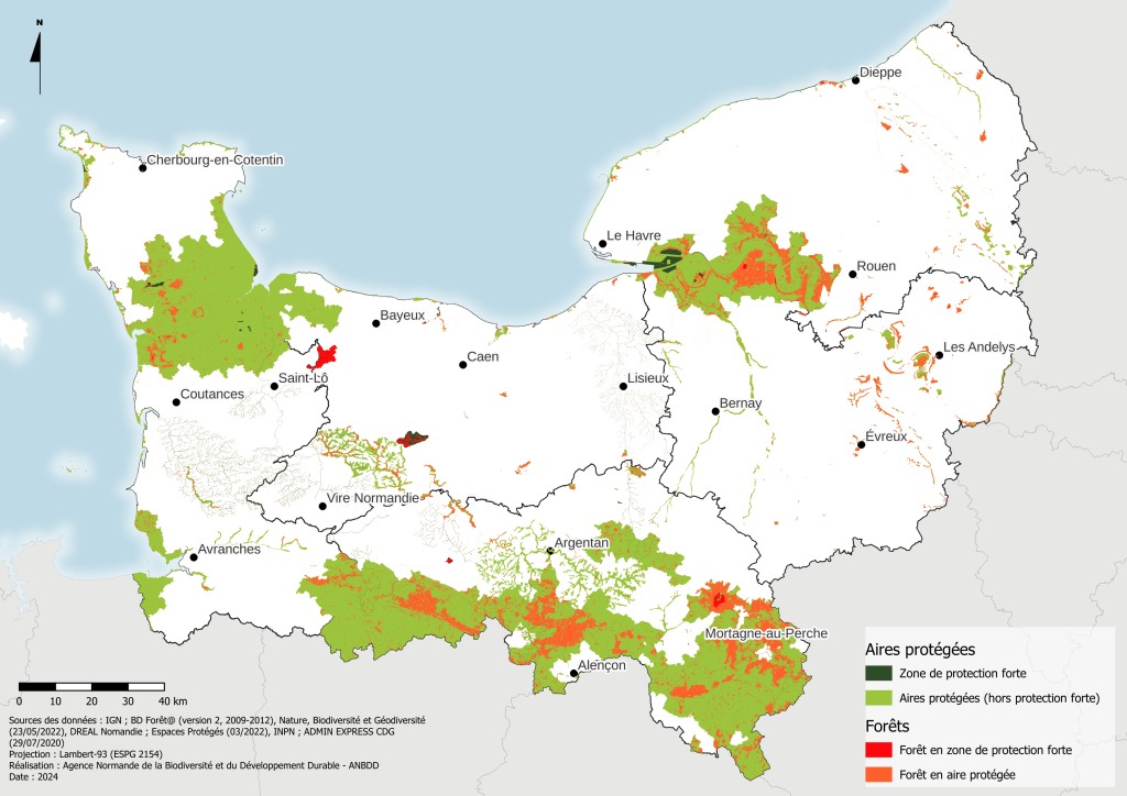 Sur les 441 000 hectares de forêts en Normandie, 157 948 hectares sont au sein d’aires protégées, soit environ 36 %.