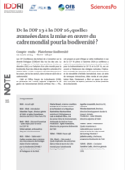 Biodiversité Publication De la COP 15 à la COP 16, quelles avancées dans la mise en oeuvre du cadre mondial pour la biodiversité ? Compte-rendu – Plateforme Biodiversité 12 mars 2024 Iddri, avril 2024, 10 p.
